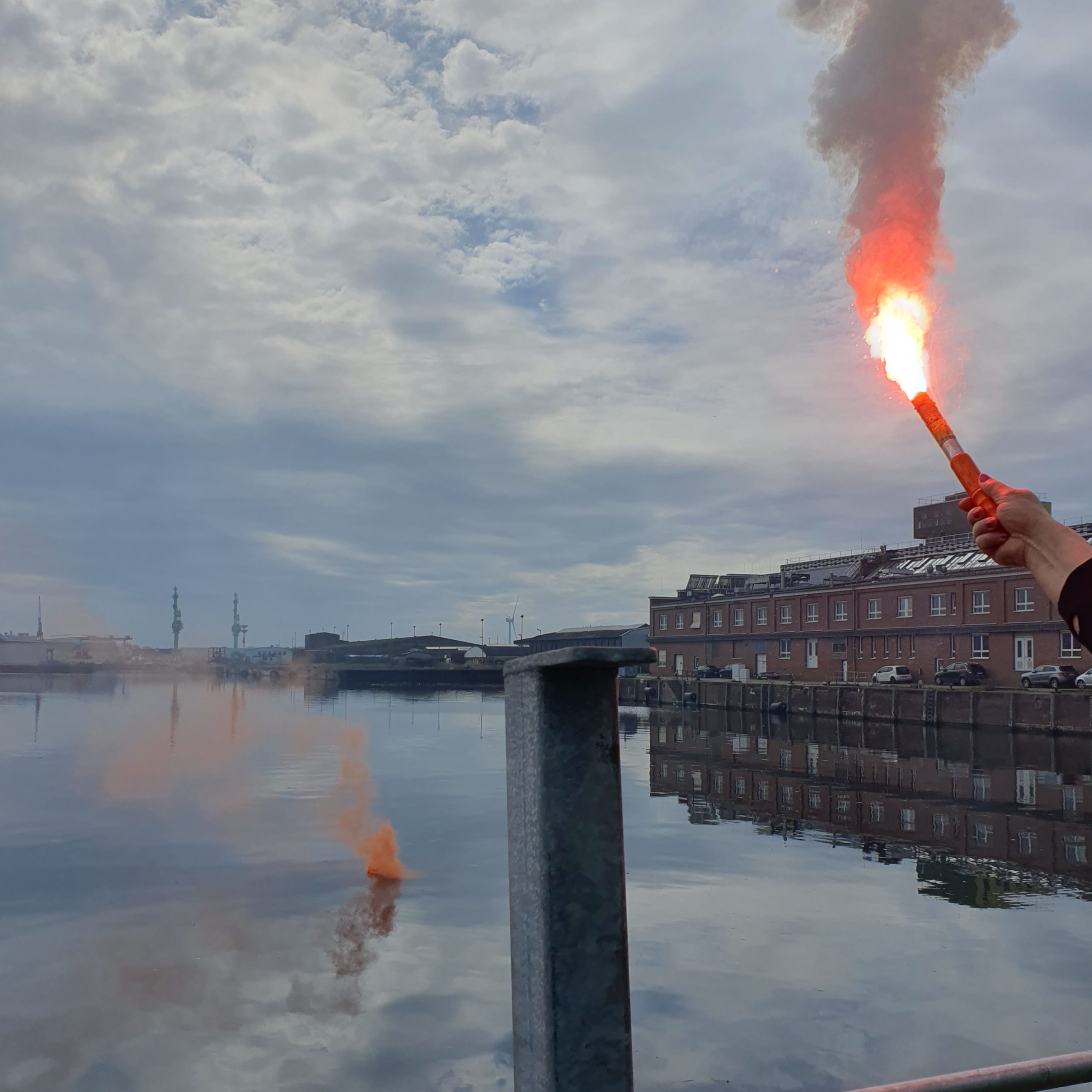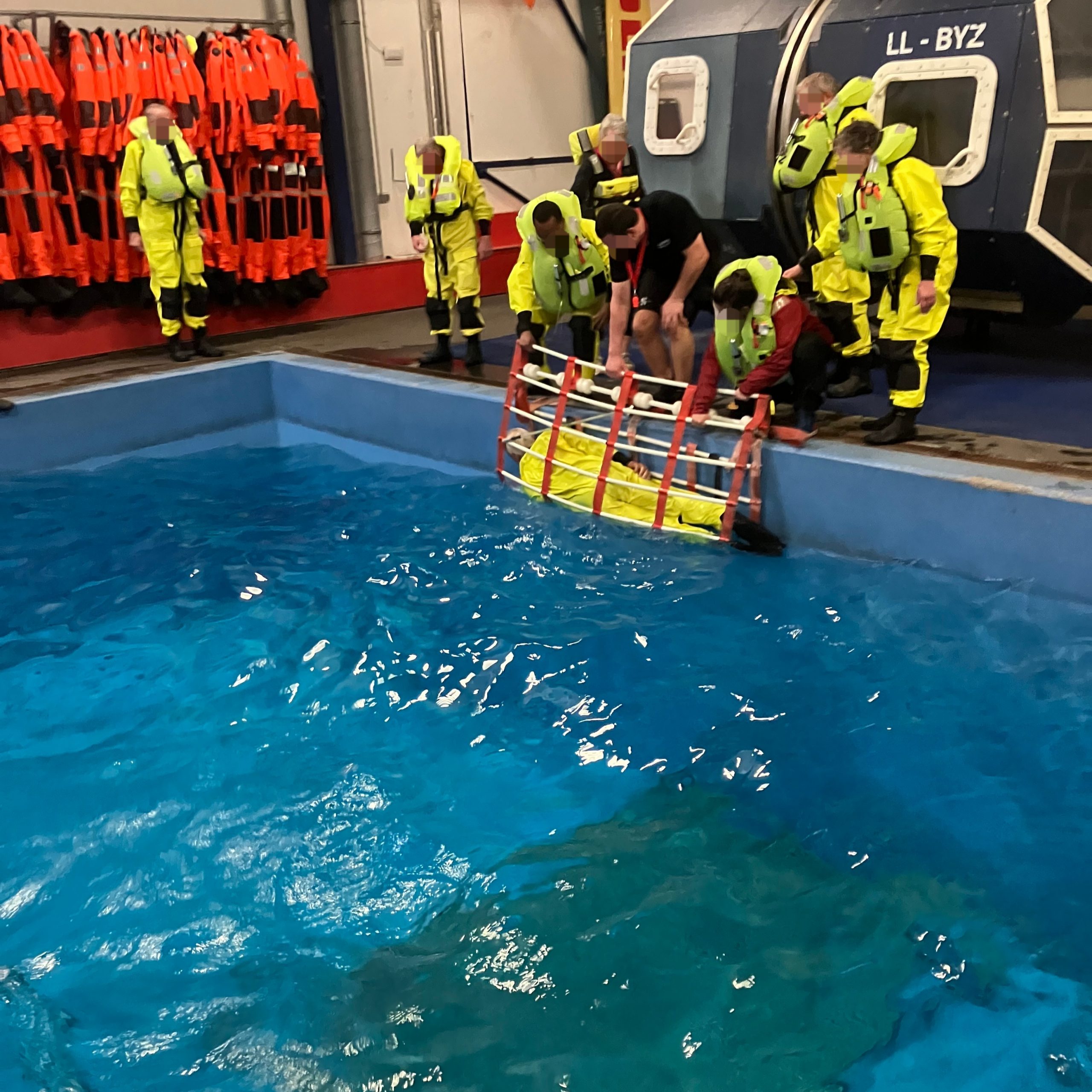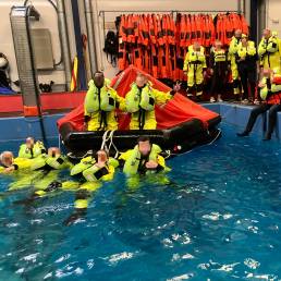 Der Tag startete mit interessantem Theorieunterricht. Nach einer kurzen Pause wurden dann am Hafenbecken Seenotsignale (Signalfackeln und Rauchtöpfe) ausprobiert. Anschließend ging es in das Übungsbecken: in voller Montur also in bereitgestellten Trockenanzügen oder selbst-mitgebrachter Kleidung, in der man üblicherweise auf See unterwegs ist. Es wurden alle Rettungswesten ausgelöst, mit Westen aus 3 Meter Höhe ins Wassergesprungen, und in der Gruppe im Wasser zusammengefunden und geübt wie man auf sich aufmerksam machen kann, auch bei Wind, Welle und Dunkelheit. Als nächstes durfte jede/r ausprobieren, eine 12-Personen Rettungsinsel umzudrehen und hineinzuklettern. Beides funktionierte dann aber im Team deutlich besser – mit allen in der Rettungsinsel wurde es dann aber ganz schön eng. Jede/r der/die wollte probierte dann noch die waagerechte Bergung einer Person aus dem Wasser aus – mal als rettende und als gerettet werdende Person.