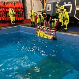 Zum Abschluss des Trainings bekam die Gruppe noch eine Aufgabe: Bei Dunkelheit, Gewitter, Wind, Regen und Welle (alles glücklicherweise simuliert, bei angenehmen 26°C Wassertemperatur) mussten alle ins Wasser springen, die Rettungsinsel erreichen und vollzählig darin Schutz suchen. Dann noch einen Dummy retten und diesen ebenfalls in der Insel in Sicherheit bringen. Alles das meisterten die Seeleute der Schiffergilde dank ausgezeichneter Teamarbeit mit Bravour. Man merkte, dass jede teilnehmende Person mit einer ganz persönlichen Motivation zu dem Training kam: Im (hoffentlich nie eintretenden) Ernstfall vorbereitet zu sein und Verantwortung für das Überleben von sich und den mitsegelnde/mitfahrende Crews, Trainees, Gästen zu übernehmen.